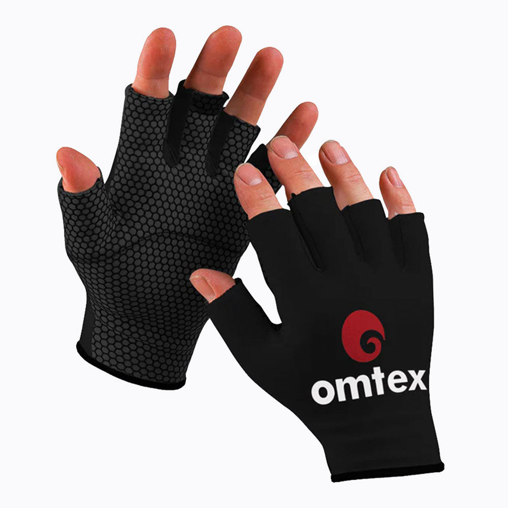Cricket Catching Gloves from Omtex made of tight fitting lycra with palms and fingers lined with impact softening gel to help reduce training injuries/bruising.
